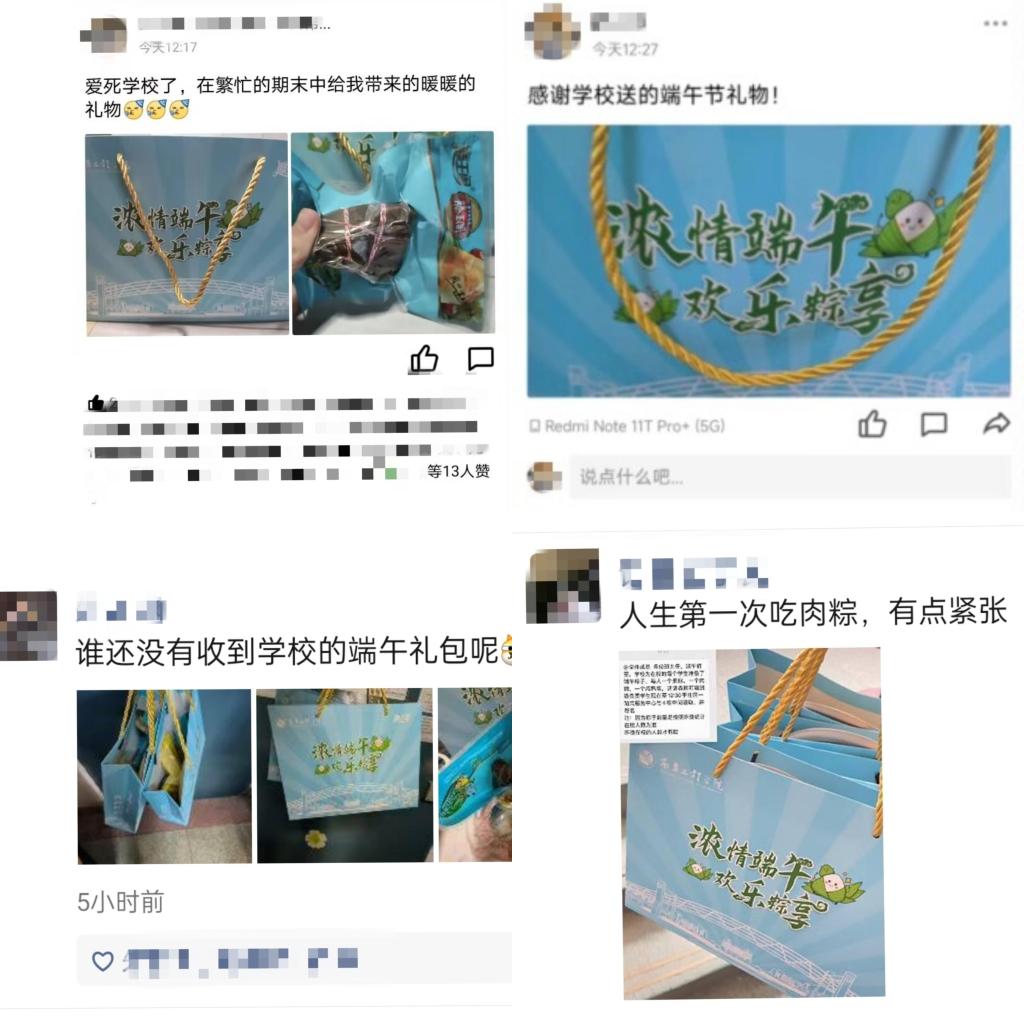 学生代表收到学校老师送来的端午节礼物高兴地表示:“谢谢老师!”“祝老师端午安康!阖家欢乐!”。同学们还纷纷发朋友圈晒幸福!