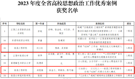 近日,省教育厅公布2023年度全省高校思想政治工作优秀论文和优秀案例征集活动评选结果,我校宋园园、付博、武厚、杜嫣艳四位教师及所带团队分别申报的题为《大学新生心理健康状况及心理素质提升研究》《高校思政教师信息技术培训感知与自我效能、TPACK的关系研究——基于结构方程模型的实证分析》《留守经历对大学生负性情绪的影响机制:追踪研究》《算法流行视域下高校网络思想政治教育新形态构建》思想政治优秀论文荣获一等奖,刘小红、洪恩强两位教师所带团队分别申报的题为《探索“1234”工作法 构筑红色文化铸魂育人新模式》《以水润心 以文化人——南昌工程学院着力打造“1234”问渠文化育人模式》思想政治工作案例荣获二等奖。(文图/陈巧雄 责任编辑 潘旭 罗婷)