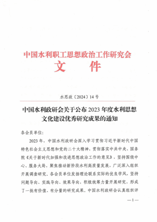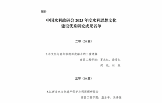 近日,中国水利政研会组织的“2023年度水利思想文化建设研究成果”评选活动揭晓,我校夏志红、涂雪仁、何钦、刘欣撰写的论文《水文化与青年修德深度融合的三重逻辑》荣获二等奖,温乐平、吴泽俊撰写的论文《江西省水文化遗产保护与利用调研报告》荣获三等奖。
