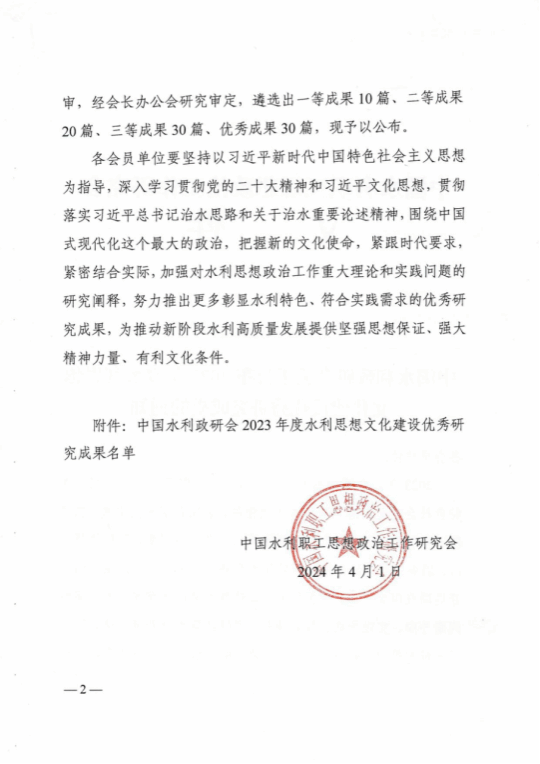 据悉,此次活动旨在深入学习贯彻党的二十大精神和习近平文化思想,贯彻落实习近平总书记治水思路和关于治水重要论述精神,坚持围绕中心、服务大局,聚焦推动新阶段水利高质量发展。此次评选共遴选出一等成果10篇,二等成果20篇,三等成果30篇,优秀成果30篇。(文图/徐金兰 熊悦 责任编辑 潘旭 罗婷)