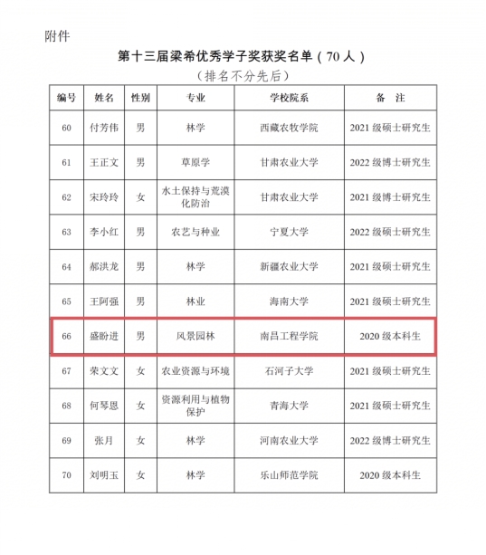 近日,中国林学会发布了第十三届梁希优秀学子奖评选结果,我校水土保持学院2020级风景园林专业盛盼进同学荣获第十三届“梁希优秀学子奖”荣誉称号。目前,我校学子已连续五届获得该奖项。