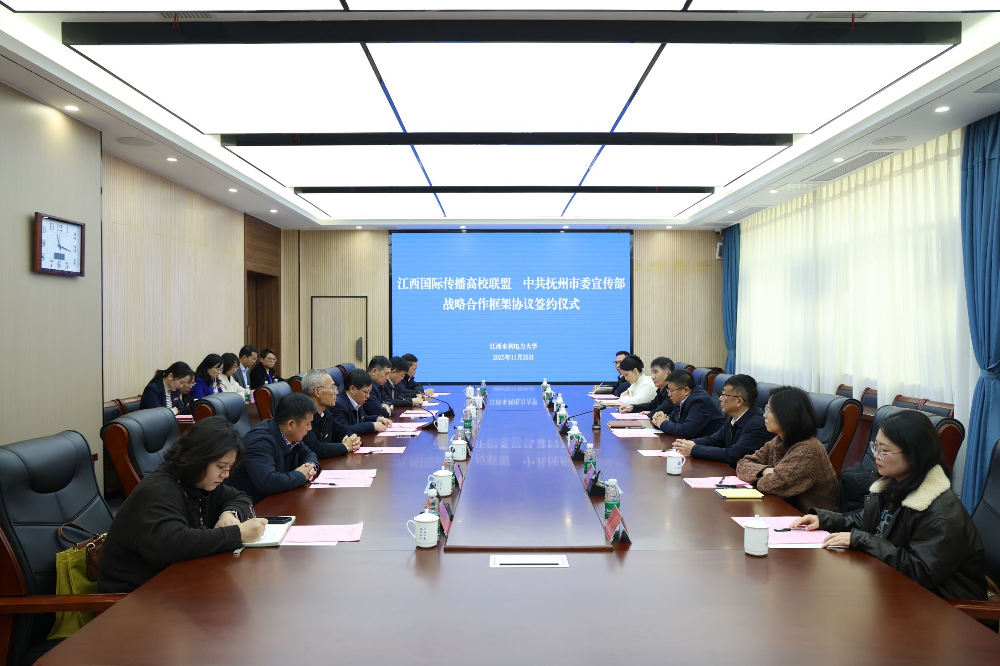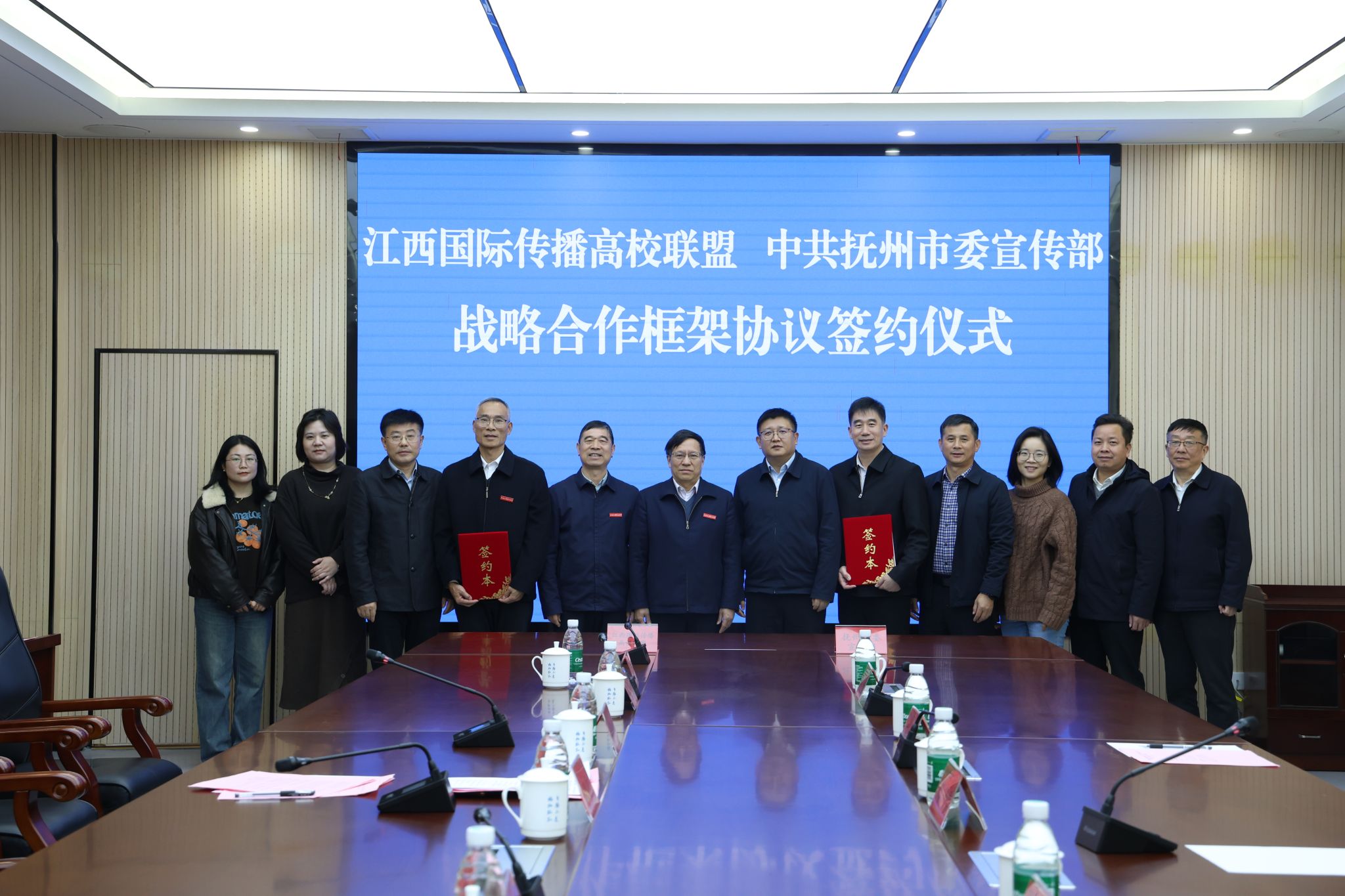 11月26日,江西国际传播高校联盟与中共抚州市委宣传部战略合作框架协议签约仪式在我校瑶湖会议中心举行。校党委书记汪胜前,抚州市委常委、市委宣传部部长廖晓勇致辞。抚州市融媒体中心党委书记、主任张春明,抚州市委宣传部副部长范强,校党委委员、党委宣传部部长、江西国际传播高校联盟秘书长洪恩强,联盟成员高校代表:南昌大学党委常委、党委宣传部部长徐亮,江西师范大学党委常委、党委宣传部部长王一喜,江西中医药大学党委委员、党委宣传部部长徐道富,江西外语外贸职业学院宣传统战处副处长温志超,中国日报江西记者站负责人赵睿楠,江西国际传播中心编辑部主任甘晶莹出席。校党委副书记、江西国际传播高校联盟理事长吴泽俊主持仪式。
