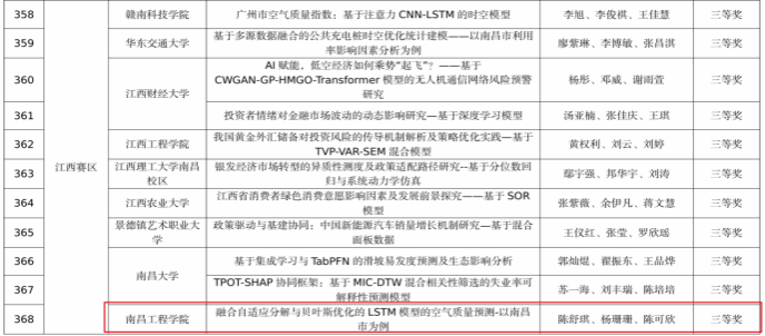 近日,2025年(第十一届)全国大学生统计建模大赛国赛获奖名单公布,我校共获得国家二等奖1项(团队人员:2023级应用统计学彭子萱、2023级应用统计学胡蓓、23级市场营销洪杨)、三等奖1项(团队人员:2023级应用统计学陈舒琪、2023级应用统计学杨珊珊、2023级通信工程陈可欣),这是自2023年该赛事纳入教育部学科竞赛白名单后我校在该项赛事上取得的一次新突破。