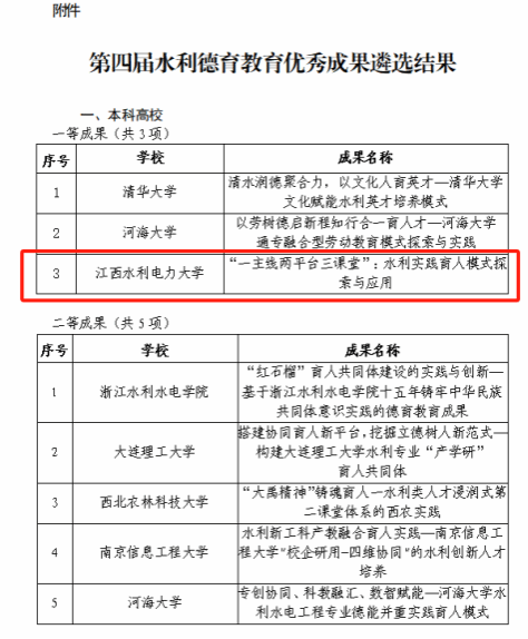 近日,中国水利教育协会公布第四届全国水利院校优秀德育教育成果遴选结果,水利工程学院党委报送的德育教育成果《“一主线两平台三课堂”:水利实践育人模式探索与应用》喜获一等奖(全国共3项),并与清华大学、河海大学等高校在第四届水利德育教育研讨会上作优秀案例分享。