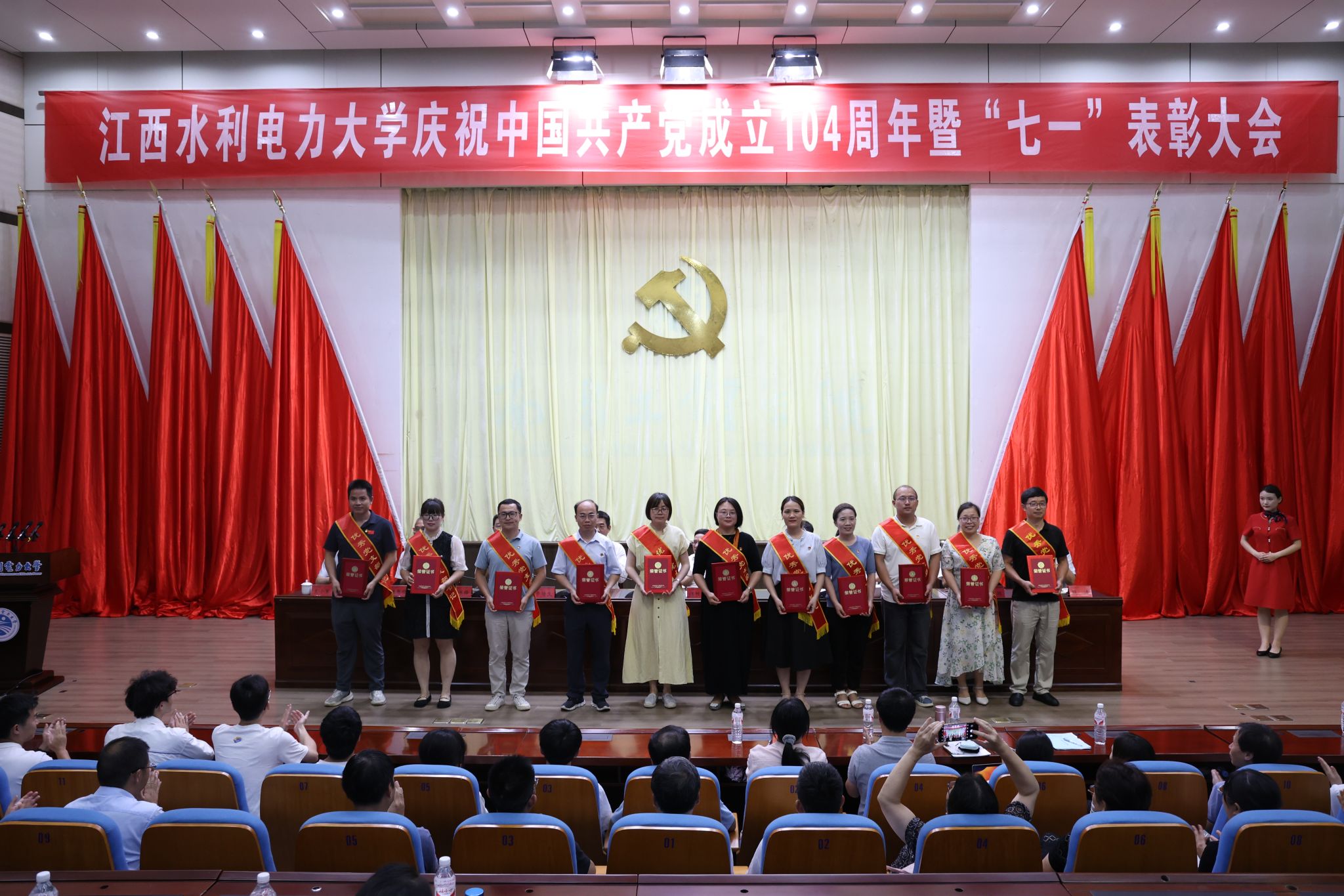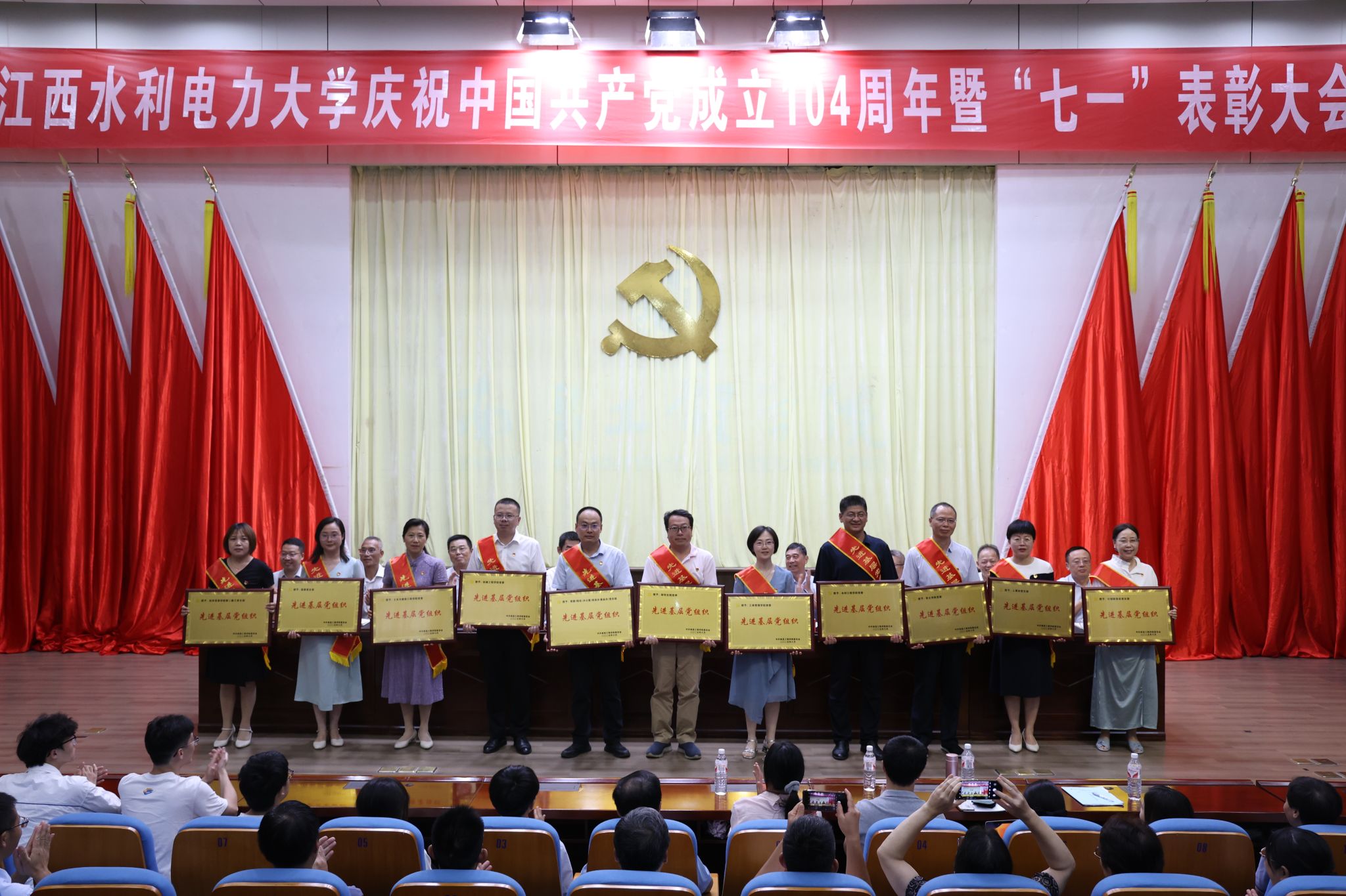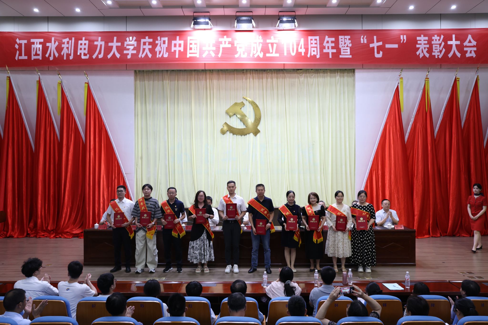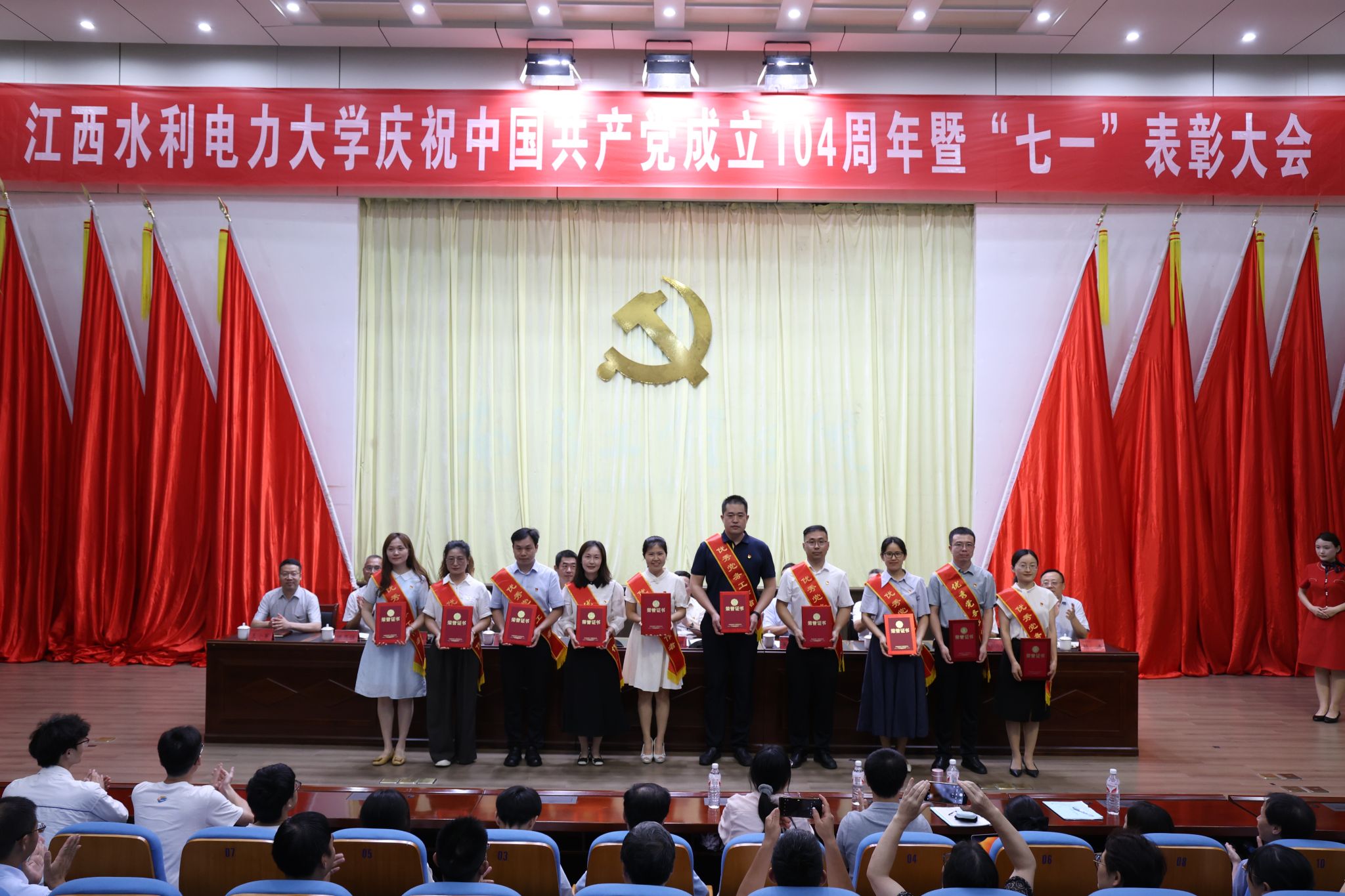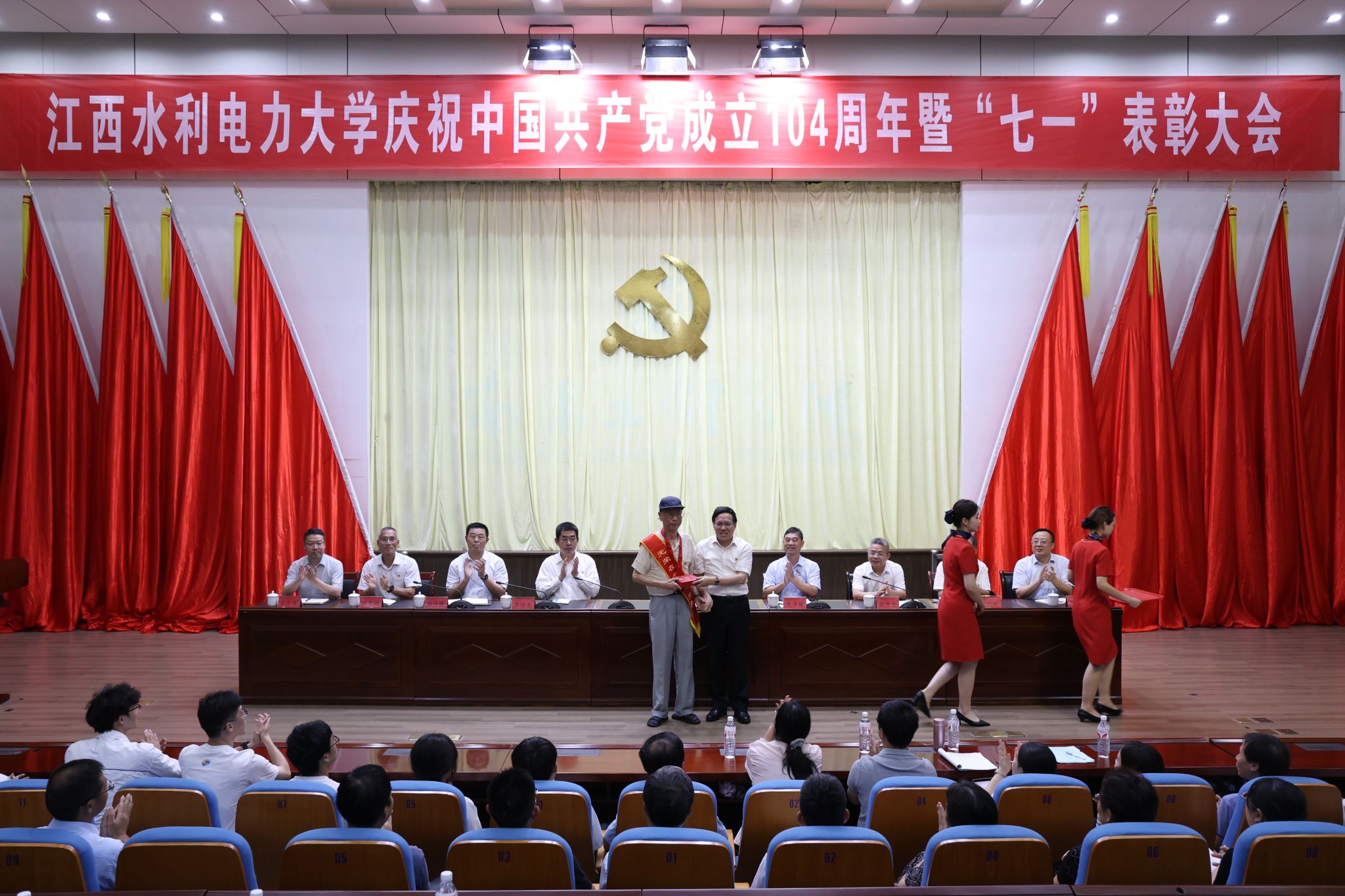 6月30日,学校在大禹学术报告厅召开庆祝中国共产党成立104周年暨“七一”表彰大会。大会向“光荣在党50年”老党员颁发了纪念章,选树了学校2024-2025学年党员先锋岗位,表彰了2024-2025学年优秀共产党员、优秀党务工作者、优秀党支部书记和先进基层党组织。校党委书记汪胜前出席大会并讲话,校党委副书记吴泽俊主持会议,校纪委书记、省监委驻校监察专员殷安全宣读表彰决定,在家校党委班子成员出席。副处级以上党员领导干部、专兼职组织员、各党支部书记、离退休老党员代表、部分党代表和受表彰的单位负责人和先进个人参加会议。