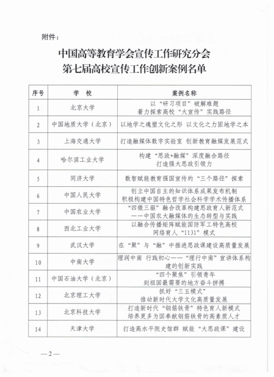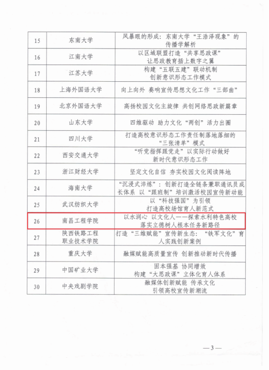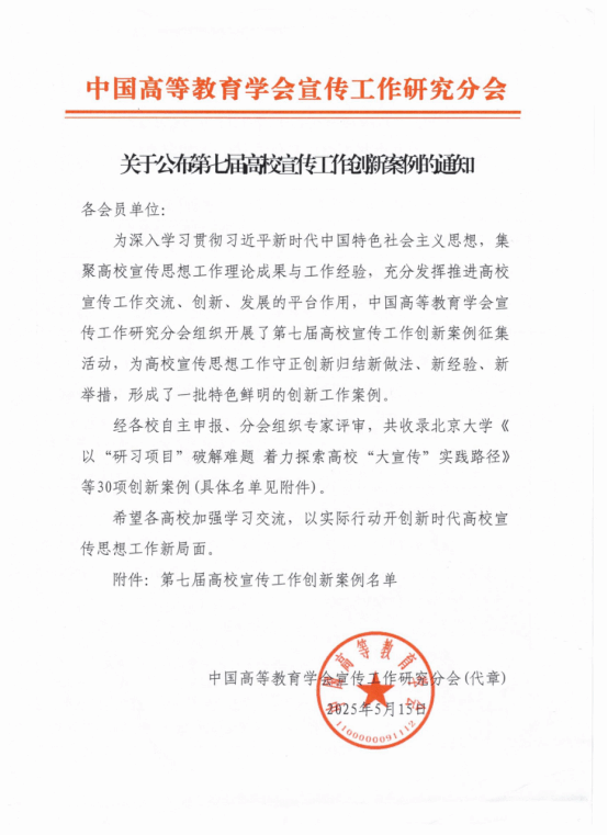 据悉,第七届高校宣传工作创新案例征集活动,旨在推广全国高校宣传思想文化工作理论成果与实践经验,更好地推进高校宣传工作交流互鉴、守正创新。经各校自主申报、中国高等教育学会宣传工作研究分会组织专家评审,共有北京大学、中国地质大学(北京)、上海交通大学、哈尔滨工业大学、同济大学、中国人民大学、武汉大学等30所高校的创新案例入选。我校成为江西连续两年入选该工作创新案例的唯一高校。(文/图 徐金兰 责任编辑 潘旭 张惠)